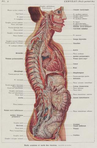 Why does this guy have his tongue sticking out? I have no idea. Although rare in Western anatomy charts, it's quite common in Eastern anatomy diagrams to see a tongue protruding from the mouth. At any rate, this side view or profile view of the human torso is entertaining and informative!